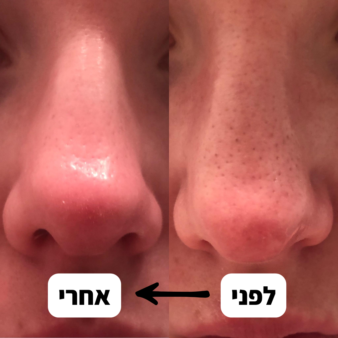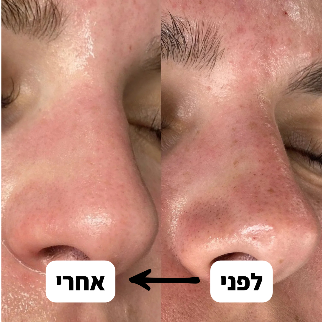התוצאה: הנקבובית מתנקה לגמרי, העור נרגע, והפנים נשארות חלקות וברורות בלי כאב ובלי סימנים.