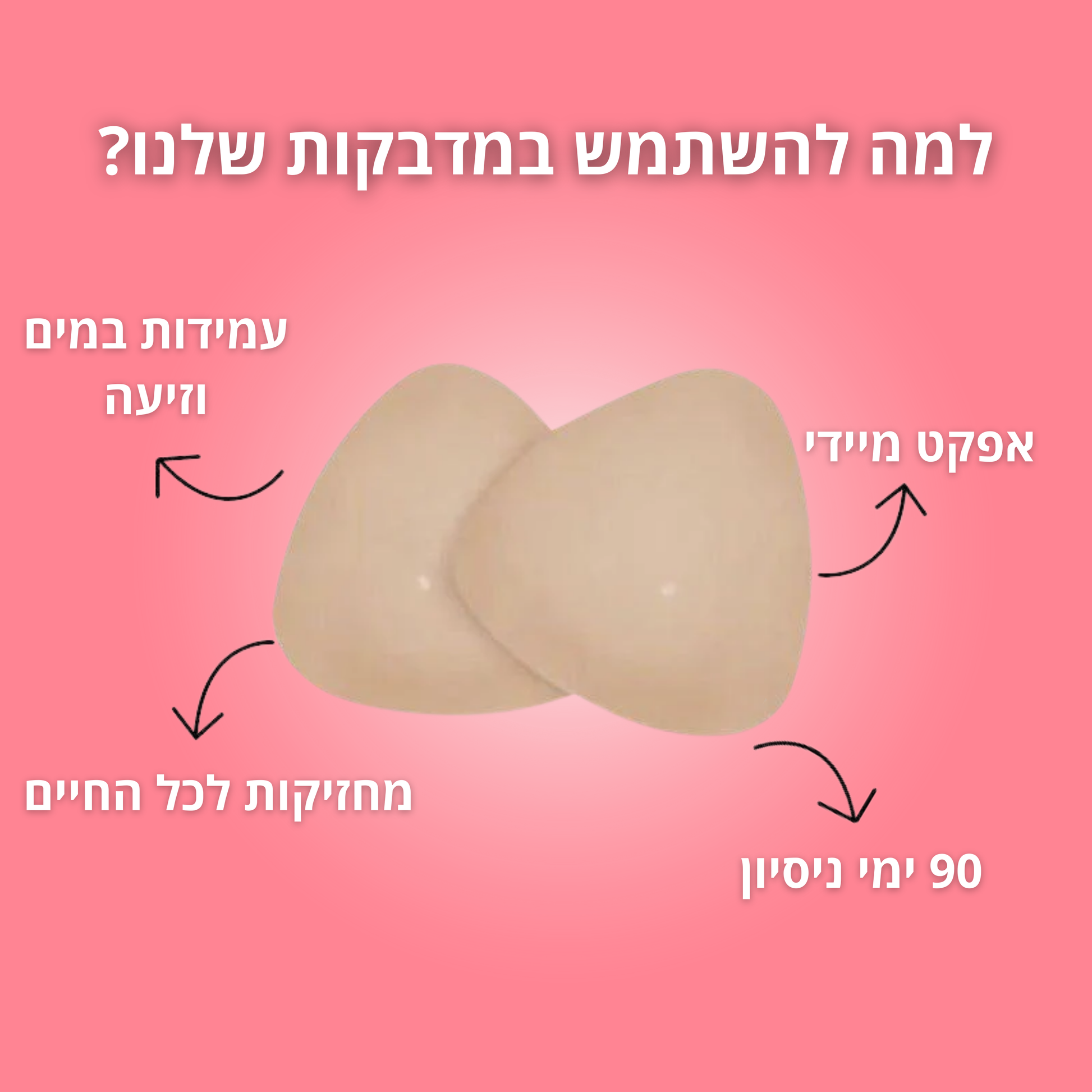 הן עשויות מסיליקון איכותי שמרגיש כמו עור שני, נדבקות בול למקום, ונשארות שם גם בים, גם בזיעה, וגם אחרי שעות. הן מתאימות לכל גודל חזה, נעלמות מתחת לכל בגד, ונראות פשוט מושלם.